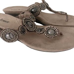 Minnetonka Women’s 9 Pewter Gray Leather Beaded Stone Wedge Thong Sandals