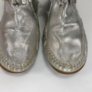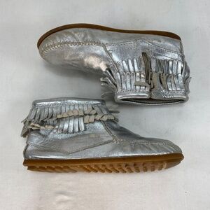 Minnetonka Silver Leather Fringe Zip Moccasins Indoor-Outdoor Wear Youth Size 4