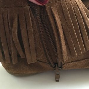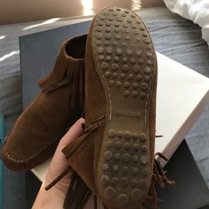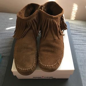 Minnetonka ashby ankle boot in dusty brown. Size 7. Zippers on sides. Worn a few times but in good condition.comes with box