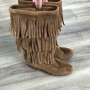 Minnetonka brown 3 layer suede fringe moccasins womens size 5