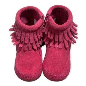 The Minnetonka hot pink double fringe boots in baby girl size 3 are an adorable and stylish choice for little ones. These boots feature a vibrant hot pink color that adds a pop of fun to any outfit. The double fringe detailing gives them a trendy and boho-inspired look. Made with soft and comfortable materials, these boots are gentle on your baby's delicate feet. The size 3 fit is designed specifically for baby girls, ensuring a proper and secure fit. Whether paired with leggings, dresses, or jeans, these Minnetonka boots will add a cute and fashionable touch to your baby girl's wardrobe. Let your little one's feet stay cozy and stylish with these adorable hot pink fringe boots.