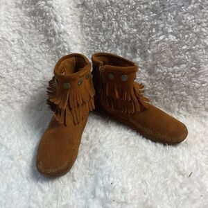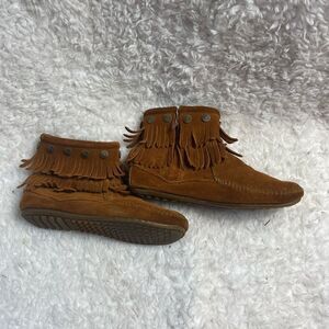 Minnetonka leather suede tan double layers of fringe ankle boots antique tone accents size 6 side zipper. Pre owned in good used condition normal wear see all pictures any questions please message.