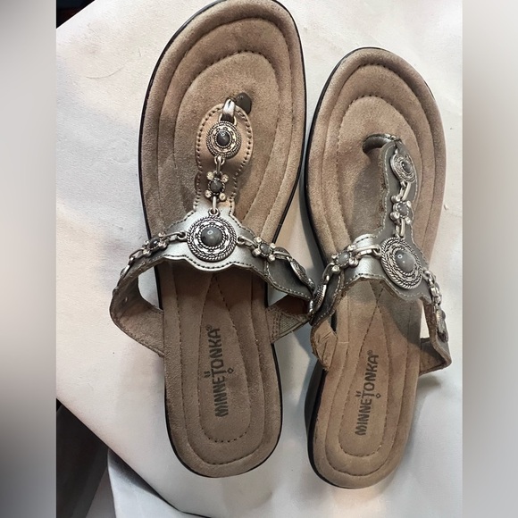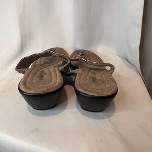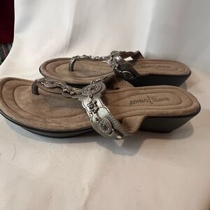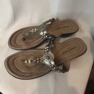 These women's sandals feature leather t-straps with silver embellishments and a cushioned footbed for a style that is effortlessly chic