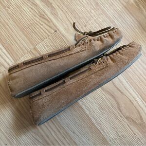 Minnetonka women’s Cally moccasin size 9 leather fur lined brown good condition. Very light wear on tread and around tread pictured.