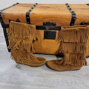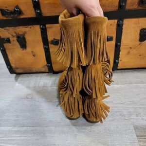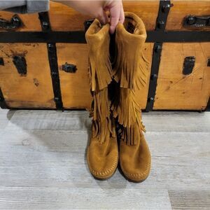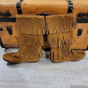 Minnetonka 1638 Calf Hi 3-Layer Fringe Brown Boots size 6