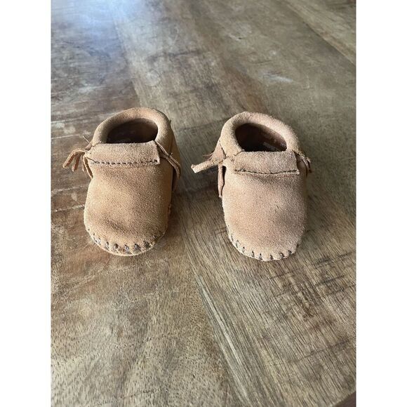 Minnetonka Baby Moccasins Size 0 Brown Suede Fringe Soft Sole Crib Shoes. Отправлен: USPS Ground Advantage.