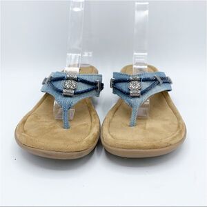 Super comfortable with a go with anything style. Barely worn condition. Braided blue leather detailing with silver accents gives these flip=flops a boho western vibe. Please see photos for additional details.