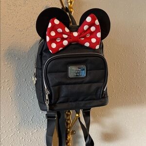 Charming Disney backpack with iconic red polka dot bow. Features playful design and spacious compartments.