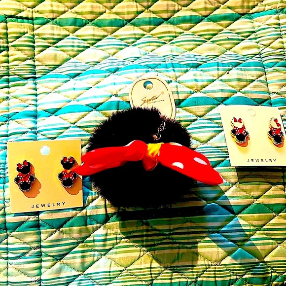 This bundle is for 4 pairs of Minnie Mouse earrings, and a Minnie mouse keychain. All are new with tags.