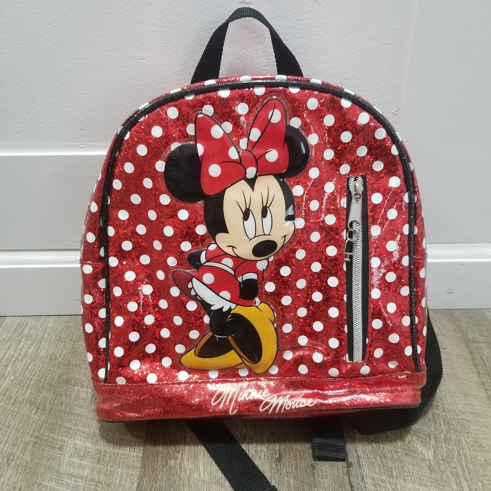 Cute Minnie Mouse red glitter and polka dot mini backpack Purchased at Disneyland Small tear on top (see last picture)
