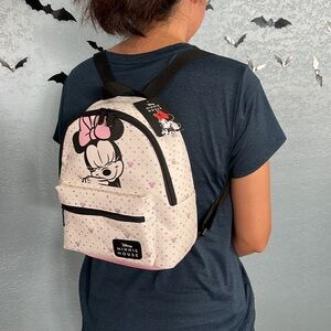 Check out this cute Minnie Mouse backpack. Perfect for everyday use or for your Disney trip. 11” height, 9” width, 4” Depth. One pocket in front for your phone.