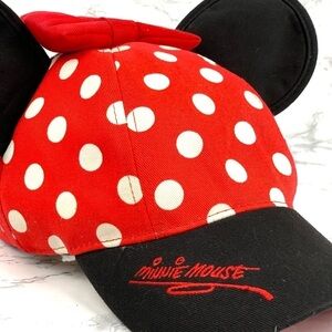 Top your day at The Happiest Place on Earth with Minnie's polka dot baseball cap trimmed in her trademark ears and bow, plus embroidered ''signature'' accent on the Brim of the Hat in Minnie's Bright Red Color.