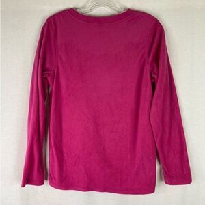 Fleece top and bottom, too has v neck with embroidered Minnie Mouse and long sleeves, bottoms have elastic waist and are footed with slip resistant bottoms.