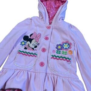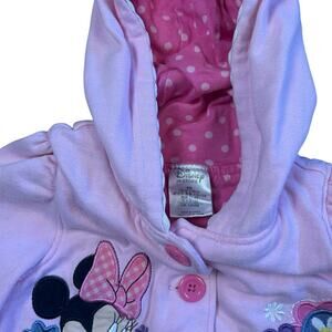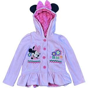 Light pink Minnie Mouse hoodie with embroidered details, polka dot lining, and 3D ears and bow on the hood. Features button-up front, ruffle hem, and floral patch pockets. Good condition.