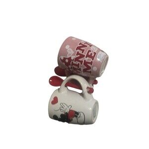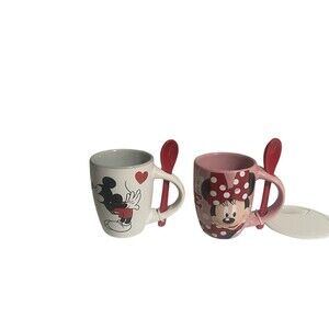 Sip your coffee or espresso in style with this set of two Minnie Mouse coffee cups, each with a matching spoon and Mickey Mouse design. These cups are perfect for any Disney fan or collector, featuring the iconic Minnie Mouse character and made in China with high-quality materials. Whether you're enjoying a morning pick-me-up or hosting a party, these cups are sure to add a touch of whimsy to your beverage. The set includes two cups, each with a unique design, making it a great addition to any collection or as a gift for a loved one. Measurements photographed. Ships quickly
