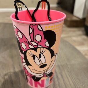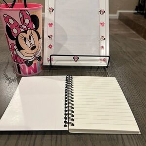 Adorable Minnie Mouse set featuring a frame, picture stand, cup, black hair clips and notebook. Perfect for Disney fans.