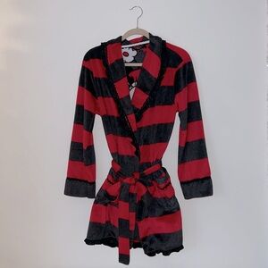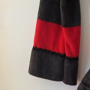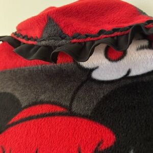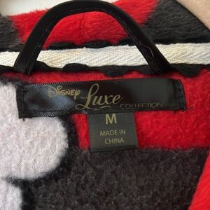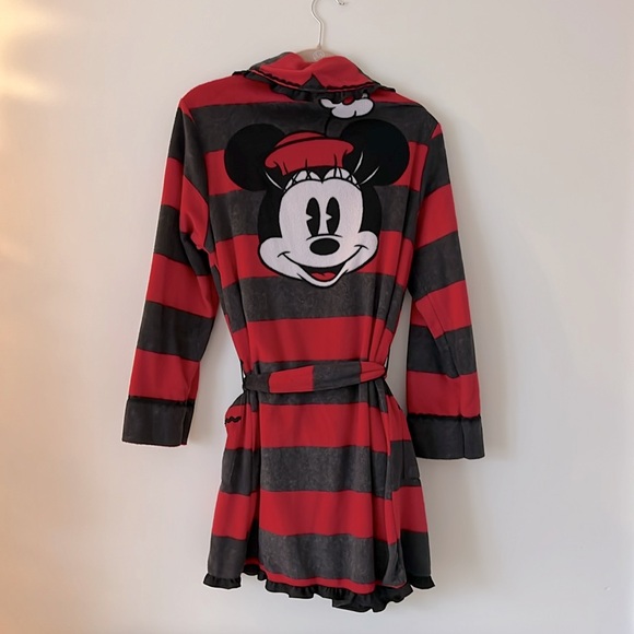Vintage Style Minnie Mouse Fuzzy Bath Robe with pockets, belt, and ruffles on the neck and bottom trims.