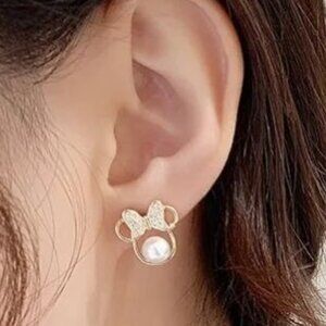 These earrings feature an iconic Minnie Mouse design with a gold-tone finish, faux pearl centers, and sparkling rhinestone bows. Ideal for adding a touch of whimsy and elegance to your outfit.