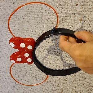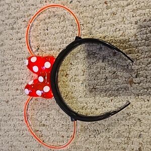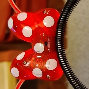 This headband features iconic Minnie Mouse ears, made with a lightweight, transparent material that glows with a captivating neon red hue. Adorning the center is Minnie's signature bow, resplendent in a vibrant red shade adorned with classic white polka dots, exuding timeless style. The headband itself is designed for comfort, ensuring a secure and graceful fit for wearers of all ages. On/off switch is on the back with battery included inside the bow.