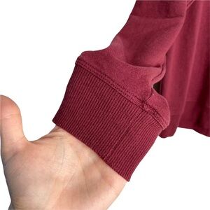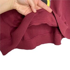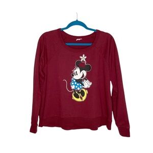 Minnie Mouse Maroon Long Sleeve Round Neck Graphic Knit Sweatshirt. No size tag but measures like a size medium. This is in used condition: one small spot on the front, wash wear and light pilling. It would be a great item to bleach dye or to wear around the house. No care tag but feels like cotton. Slightly longer in back.