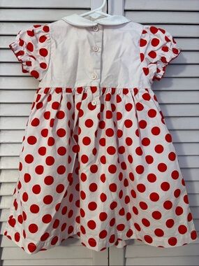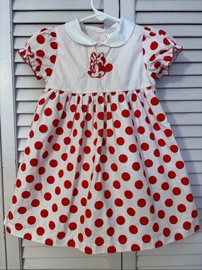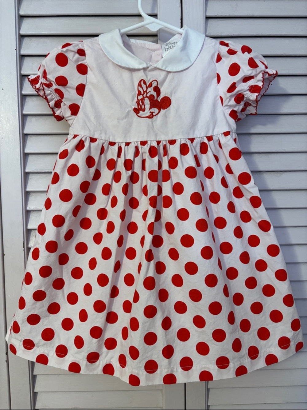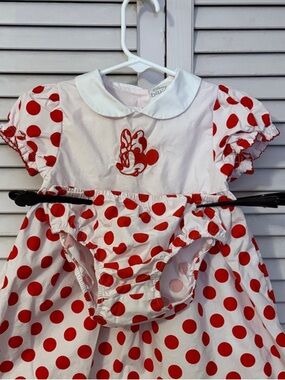 Disney Baby matching set with classic Minnie Mouse motif. White bodice with embroidered Minnie face cascading into a red polka dot empire waist fully lined dress with puff sleeves. Soft 100% cotton fabric with Peter Pan collar. Matching diaper cover included. A playful yet classic design.