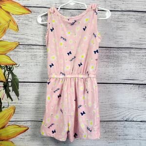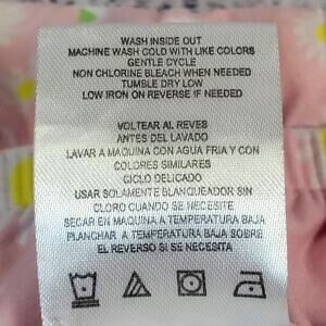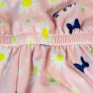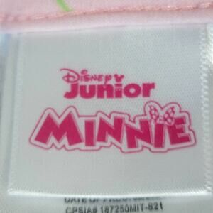 Pink with yellow, green, and white daisy's, blue bows, blue "Minnie patterns