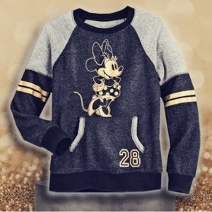 Minnie strikes gold on this soft and sporty knit sweater with long raglan sleeves, pouch pocket, french terry interior, and golden character art.