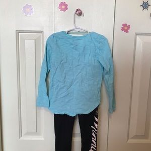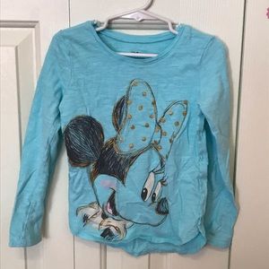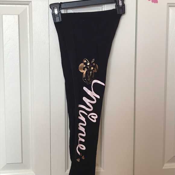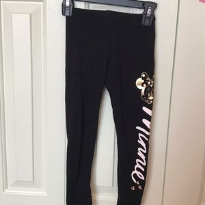 Blue long sleeved top with Minnie Mouse on it, black leggings with Minnie written on the side and a little picture of her
