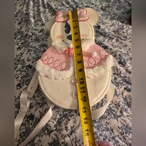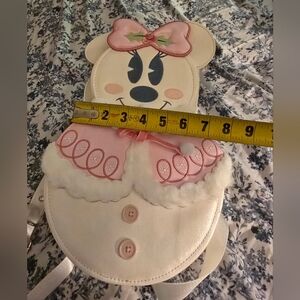 Adorable Minnie Mouse snowman backpack! This bag is so cute, it is like new condition. It does bend easily so you just have to be careful with the material. Please see all photos! There are no marks, stains etc. It comes from a smoke free home. The interior is fabric. The details of this bag are so cute. Measurements included. Please remember Poshmark does take 20% seller fees. Thanks for looking!