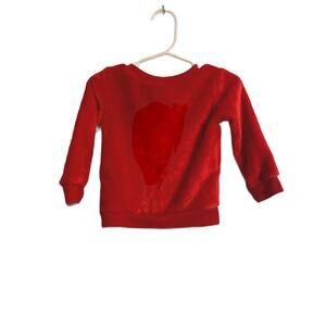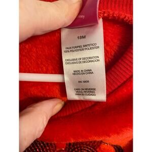 A deep red sweater with Minnie Mouse on the front adorned with sequins. Black polka dot pants. Size 18 Months. Excellent condition - no sign of wear.