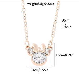 Description: Add a touch of charm to your look with this Minnie-inspired bow necklace, crafted from S925 sterling silver with a luxurious rose gold-plated finish. The delicate bow is adorned with sparkling cubic zirconia, creating a timeless and elegant design. Featuring a secure lobster clasp and a comfortable 19.68-inch chain, this necklace is perfect for everyday wear or special occasions.