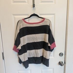 Minnie Rose 100% Cashmere Striped Short Sleeve Sweater. Cream and gray striped with pink accents. Oversized fit. Great condition.