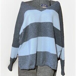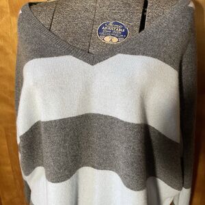 Minnie Rose 100% Cashmere Sweater Gray Blue Stripe V-Neck Pullover Womens XS/S