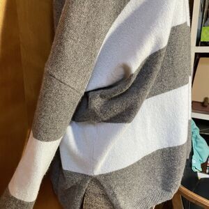 Minnie Rose, 100% cashmere, striped sweater, gray blue, v-neck pullover, relaxed fit, slouchy, high-low hem, soft knit, minimalist, cozy, quiet luxury, elevated basics, womens XS/S