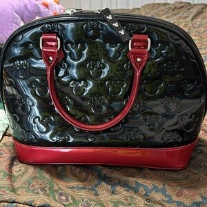 Red and Black glossy embossed Minnie loves Mickey Loungefly pocketbook. This has never been used and comes with a cloth protector bag.