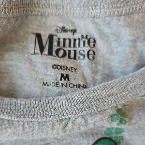 Celebrate St. Patrick's Day in style with this Disney tee featuring Minnie Mouse in a charming green outfit. The light gray fabric is adorned with playful green shamrock patterns, making it a festive choice for casual wear. Enjoy the comfort and classic round neckline of this short sleeve top, perfect for any Disney fan.