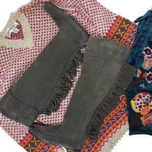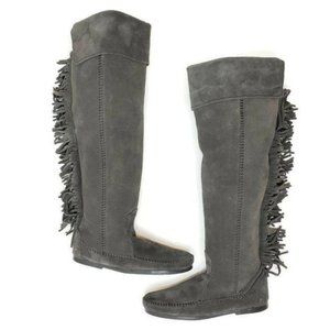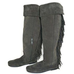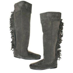 Minnitonka NWT over the knee fringe leather boots charcoal gray sz 5 small feet