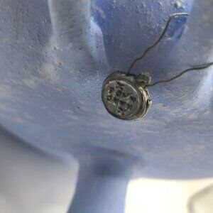 Has an imperfection on paint on rim, and comes from a smoke free, pet free home. It's 7 inch Diameter, and 3.5 inches tall.