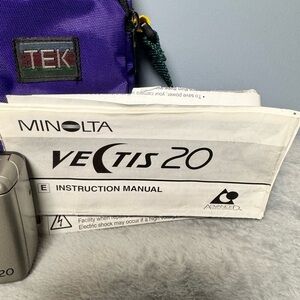 Vintage Minolta Vectis 20 APS point-and-shoot film camera. Includes original instruction manual and a retro purple TEK camera bag with strap.
