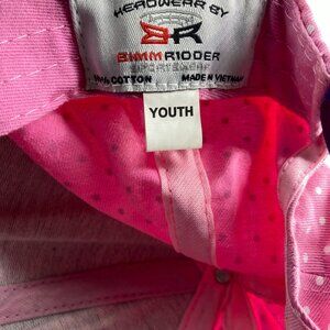 Youth-sized snapback hat designed by Bimm Ridder for Minor League Baseball. Features a stylish pink and navy polka dot design with adjustable fit.