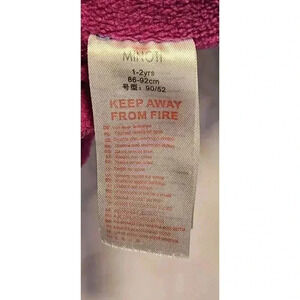 Toddler girls fleece lined rain coat, size 1-2yrs. This rain jacket has a two button and one snap closure, it is blue in color with white paisley pattern birds and has a deep pink fleece color for the lining. It flares out at the waist to allow the little ones free movement to enjoy the out doors. The shell is 100% polyurethane and the lining is 100% polyester, it was made in China and is machine washable.
