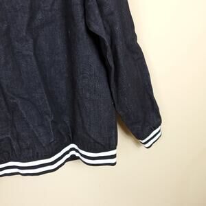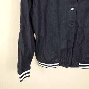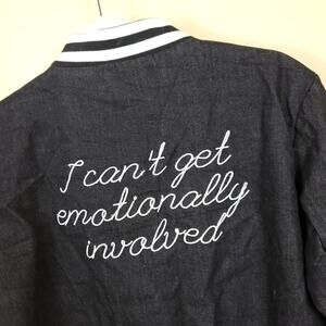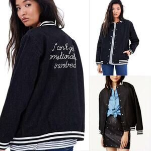 NWT. Fall in love w/this sassy yet classy denim varsity jacket. Classic yet trendy dark denim fabric w/a cheeky embroidered slogan on the back that any woman can relate to, saying "I can't get emotionally involved." Striped trimming ads retro sporty vibes to a classic varsity silhouette. This unique is extremely versatile, day or night-perfect for a casual event, girls night out or a hot date. Snap closure in front, 2 front slit pockets doesn’t love anything w/pockets.