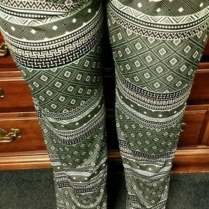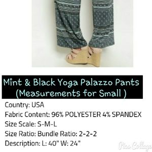 Mint, gray, & black yoga-style (fold-over waist) Palazzo Pants. Silky smooth. Fit true to size. Approx 40" long, unfolded, 30" Inseam. Stretchy and classy.