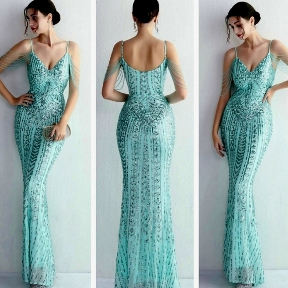 Mint Blue, V Neck, Sleeveless, Strapless, Draped Beads, Sequined Merm…