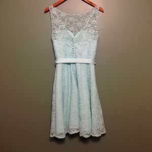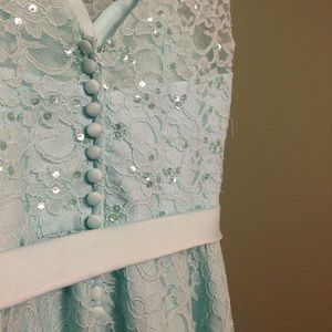 Delicately Beaded Lace Morilee Bridesmaid Dress with Illusion Neckline, Matching Tie Sash and Pockets. Runs Small, Fits a 5'7 Size 4.
