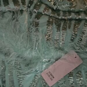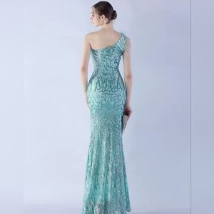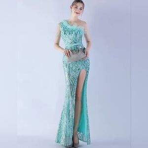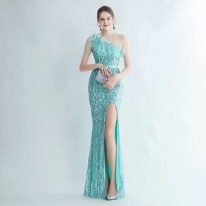 Mint Green, Assymmetrical Feather BeadedNeck, Graphic, Slit Thigh, Sequined Gown