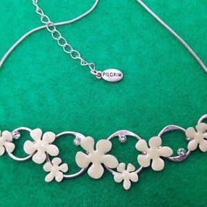 Light Mint Green Danish Design Necklace with Light Green Glass Jewels. Measures 14" end to end with 3.5" extender. Great color for summer. Jewelry tag says Danish Design on one side and Pilgrim on the reverse.