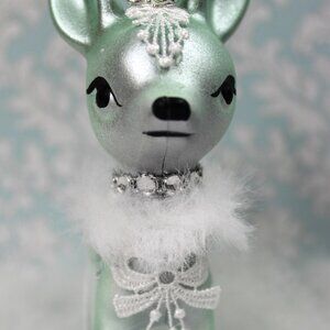 These retro mint green vintage style deer figurines feature adorable embellishments: crown, fur boas, jewels, lace trim, teal and green bottle brush trees, and a white ceramic house with a sparkly roof. The deer are made of hard molded plastic. This vignette is an instant winter wonderland collection! Add this 5-piece set to your retro vintage Christmas decor, or gift to the retro lover in your life!