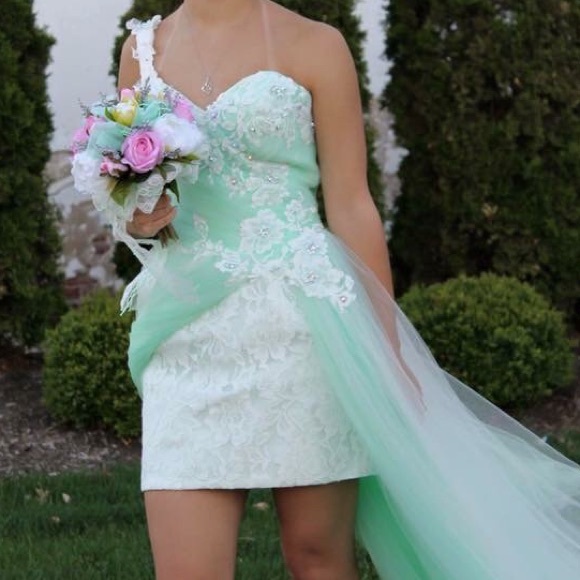 Size 6, zips in the back, tulle bottom, lace top with delicate beading, one strap
