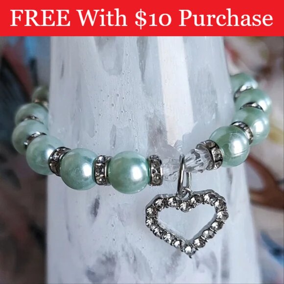 Mint Green Faux Pearl Bracelet Clear Rhinestone Heart Charm Bracelet RED BANNER